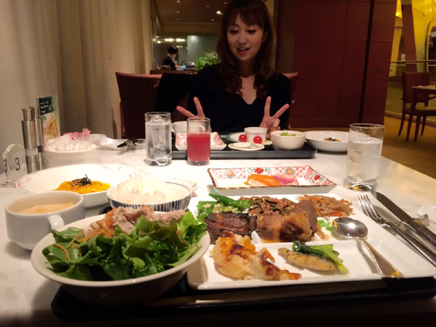 私はお寿司、パスタ、豚の角煮、フォアグラのジュレ、お蕎麦などなど。共演者のピアノの名倉氏は、手前に見える通り。一日分の栄養をこの一食で!って感じですねw