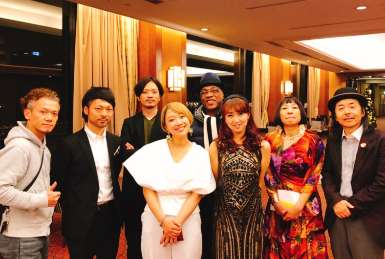 今日のミュージシャン集合写真です♪♪♪(左から、ドラムの梶原大志郎氏、ピアノの永田有吾氏、ベースの坂崎拓也氏、ボーカルのSOAさん、ボーカルのCurtis Traylor氏、私、ボーカルのKIYOKAさん、ギターの畑ひろし氏。)