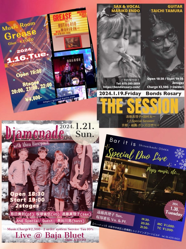 1/16(火)祇園 Music Room Grease … 古き良き時代のポップスミュージックを、ギター&ボーカルのRuthさんと、パーカッションのRioちゃんとで奏でます。アメリカンカジュアルなお店で、私はサックスも歌もピアノも🎶