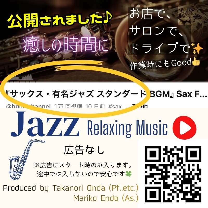 ピアニスト🎹恩田貴則氏の手がける、YouTubeの大人気BGMチャンネル✨に、私のアルトサックス🎷も参加させて頂きました😊